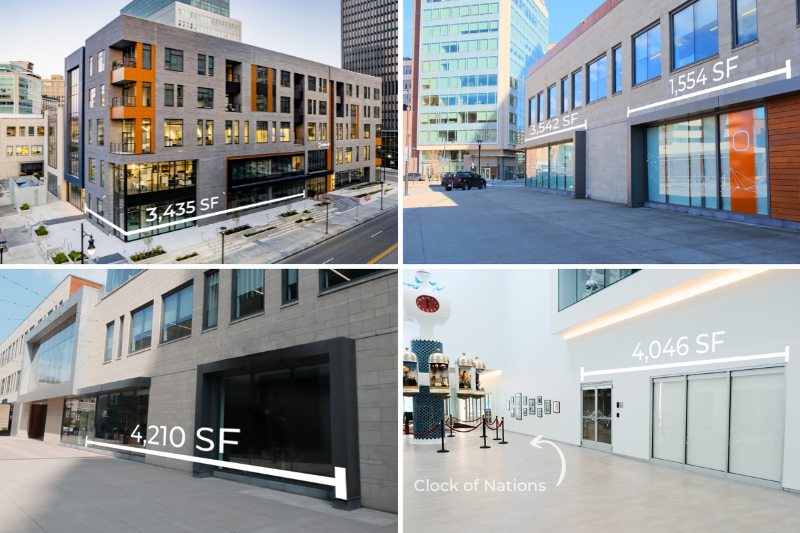 All ground-floor spaces are entirely customizable to suit your needs with four out of five spaces boasting patio space and direct outdoor access for those cherished warmer months. Additionally, a 4,046 SF interior space is available, accessible through the Tower280 lobby, looking out to the Clock of Nations, ideal for office/retail use.