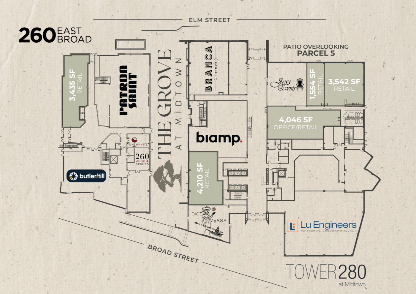 All ground-floor spaces are entirely customizable to suit your needs with four out of five spaces boasting patio space and direct outdoor access for those cherished warmer months. Additionally, a 4,046 SF interior space is available, accessible through the Tower280 lobby, looking out to the Clock of Nations, ideal for office/retail use.